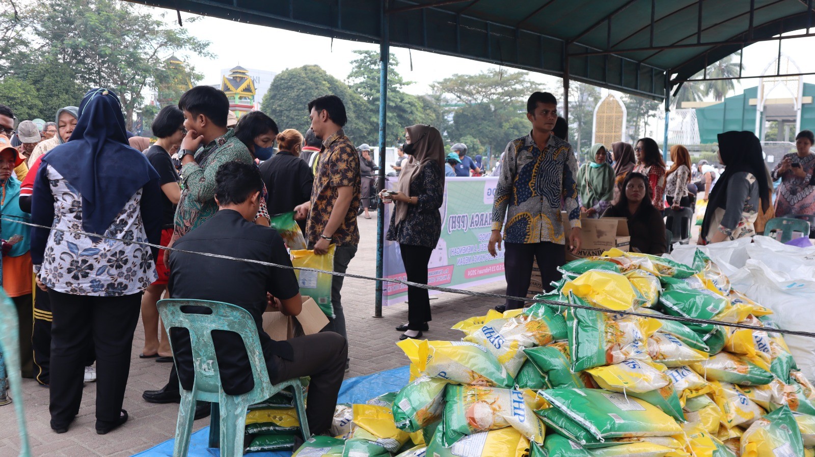 “Hari ini ada 10 ton beras, masyarakat dapat membeli 2 karung beras per orang, namun besok belum dapat kita pastikan. Kita akan sesuaikan dengan ketersediaan beras dan jumlah antrian. Harga beras medium 43.000/5 kg, minyak goreng 14.000/L dan gula 17.000/kg.” Lanjutnya.