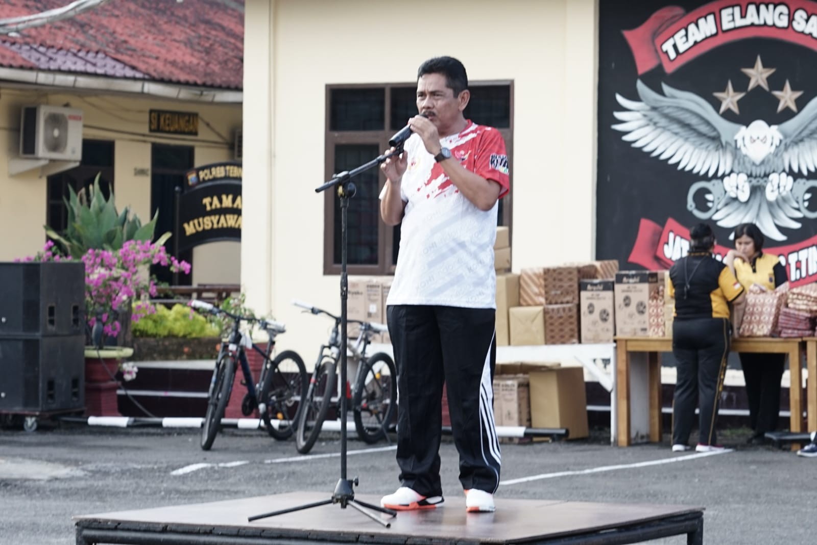 Penjabat (Pj.) Wali Kota Tebing Tinggi Muhammad Dimiyathi, S.Sos., M.TP mengikuti giat senam bersama jajaran Polres Tebing Tinggi, Batalyon B Sat Brimob Polda Sumut dan Kodim 0204/DS, Selasa (02/05/2023) di halaman Mapolres Tebing Tinggi.