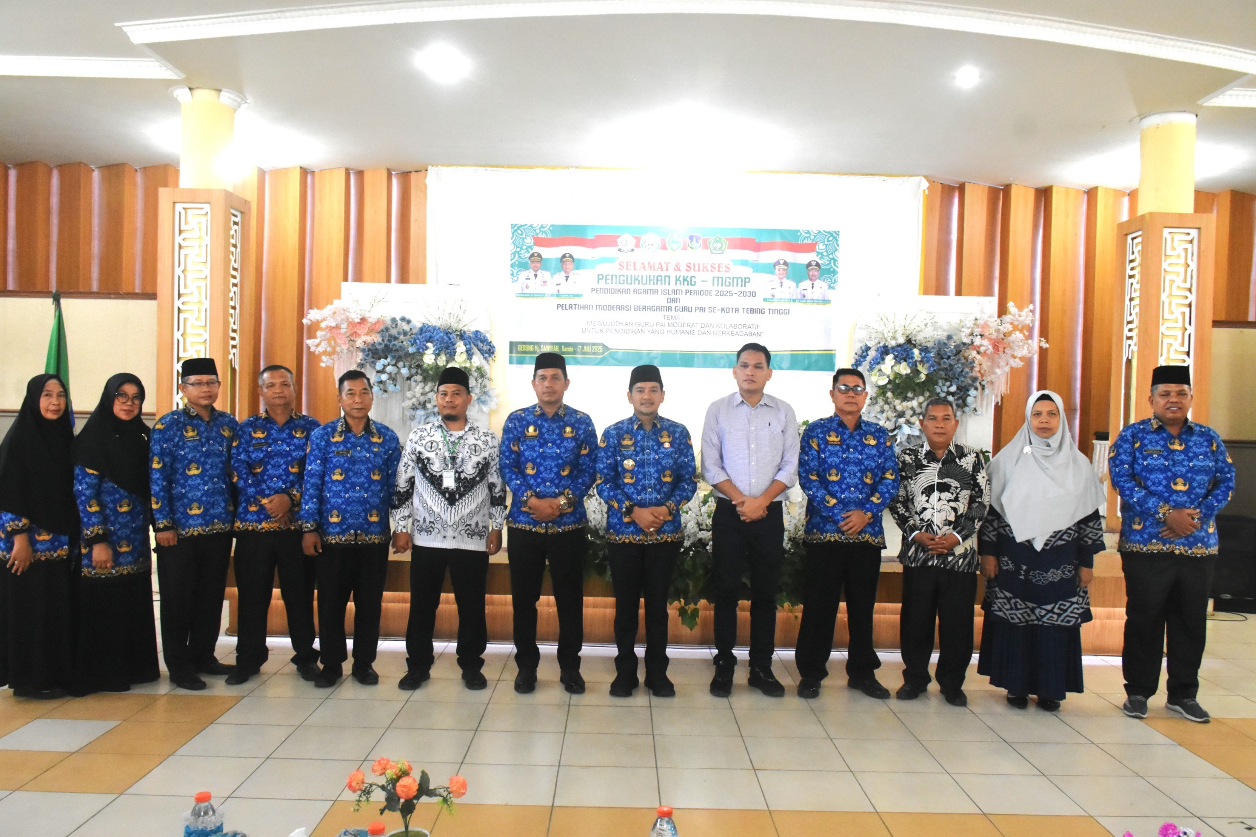 Wali Kota Tebing Tinggi, H. Iman Irdian Saragih, menghadiri pengukuhan Kelompok Kerja Guru (KKG) dan Musyawarah Guru Mata Pelajaran (MGMP) Pendidikan Agama Islam (PAI) Periode 2025-2030, sekaligus membuka Pelatihan Moderasi Beragama Guru PAI se-Kota Tebing Tinggi, Kamis (17/7/2025) di Gedung Hj. Shawiyah, Jalan Dr. Sutomo.