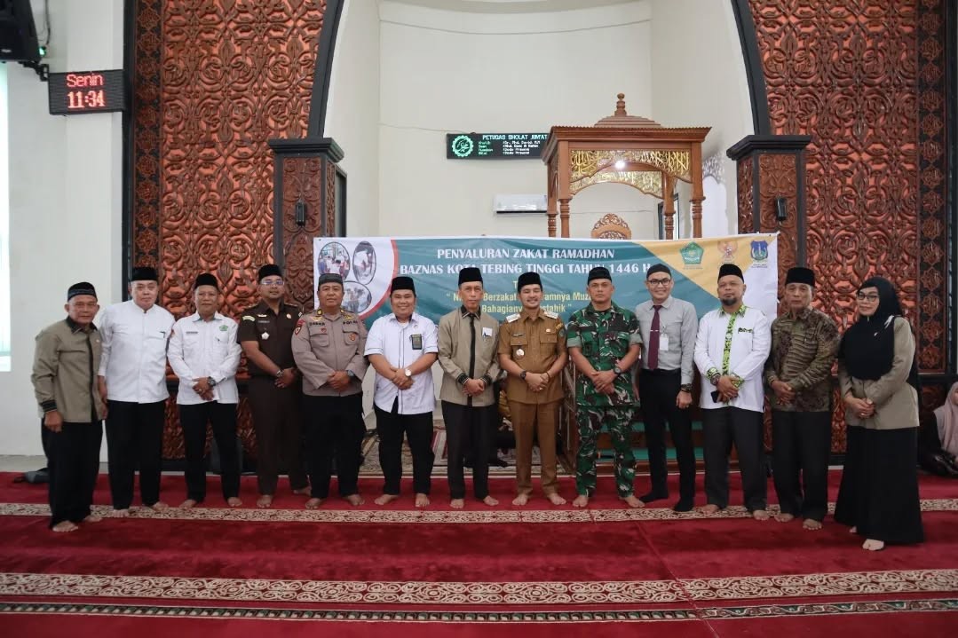 Wali Kota Tebing Tinggi, H. Iman Irdian Saragih menghadiri acara penyaluran zakat Ramadhan 1446 Hijriah kepada 1.041 mustahik, yang diselenggarakan oleh Badan Amil Zakat Nasional (BAZNAS) Kota Tebing Tinggi di Masjid Agung, Jalan K.L. Yos Sudarso, Senin (24/3/2025).