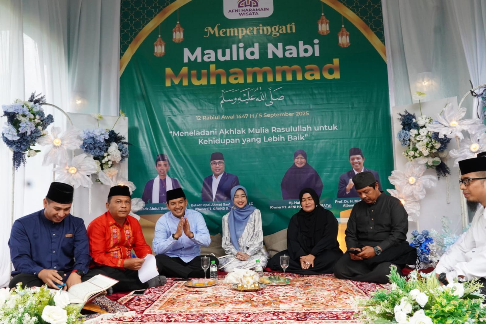 Wali Kota Tebing Tinggi H. Iman Irdian Saragih didampingi Ketua TP PKK Ny. Hj. Susmira Wanti Iman Irdian Saragih, menghadiri undangan Tabligh Akbar dalam rangka memperingati Maulid Nabi Muhammad SAW 1447 H (Hijriah), yang diselenggarakan PT. Afni Haramain Wisata Travel dan Haji, Jumat (5/9/2025) di Jln. Selat Sunda No. 94, Kelurahan Mandailing.