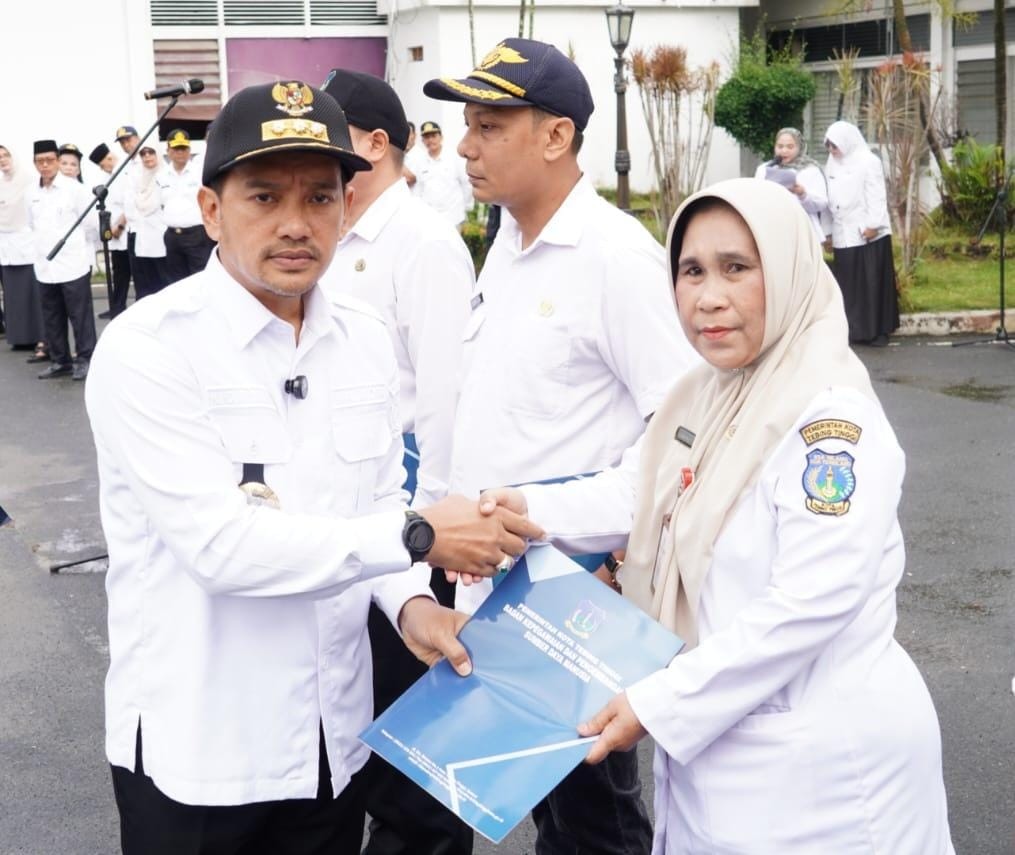Wali Kota Tebing Tinggi H. Iman Irdian Saragih, menyerahkan 9 Surat Keputusan (SK) sebagai Pelaksana Tugas (Plt.) Pejabat Struktural dalam apel gabungan Aparatur Sipil Negara (ASN) di lingkungan Pemerintah Kota (Pemko) Tebing Tinggi, di halaman Balai Kota, Jl. Dr. Sutomo, Rabu (20/8/2025).